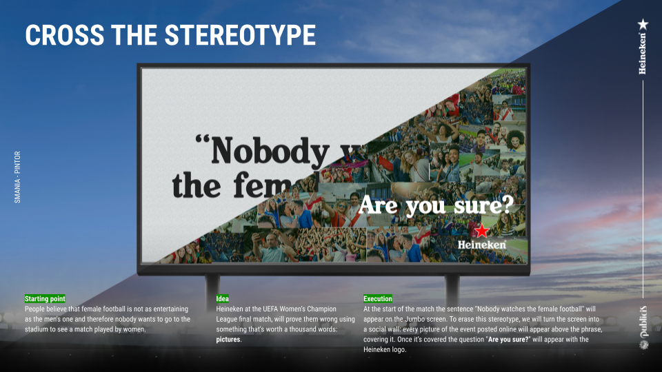 In qualità di sponsor ufficiale della UEFA Champions League, Heineken ha sempre sostenuto il calcio a 360°, con eventi, PR e attivazioni pensate per coinvolgere ogni tipo di tifoso. Per la finale della Champions League femminile, l’obiettivo era chiaro: dare voce a un’idea capace di farsi notare e, soprattutto, di rompere uno stereotipo ancora troppo diffuso sul calcio femminile. Un progetto pensato per celebrare il talento, l’intensità e l’universalità di questo sport, al di là del genere.